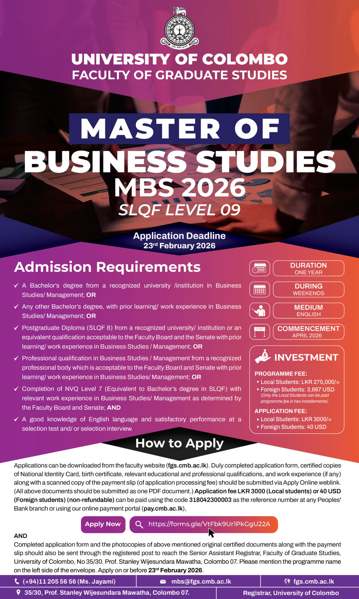 DURATION: One (01) Year Address Faculty of Graduate Studies, 35/30, Prof. Stanley Wijesundara Mawatha, Colombo 07, Sri Lanka View map Categories Courses , FGS , Masters Read more Related Course Advance Certificate course in Ayurveda Caregiving Application Calling for Counselling & Psychology Course Programs – IHRA
