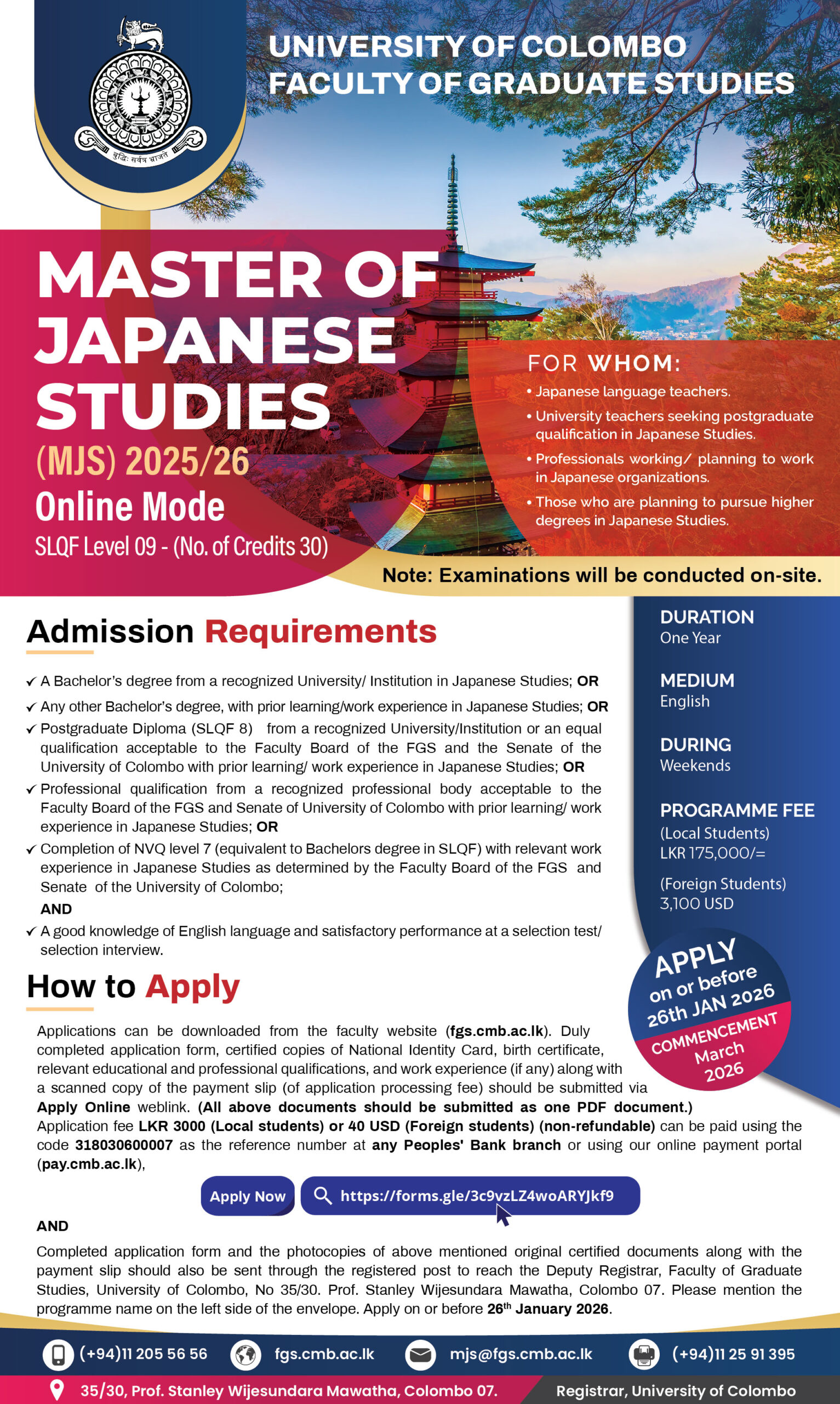 DURATION: 1 Year Address Faculty of Graduate Studies, 35/30, Prof. Stanley Wijesundara Mawatha, Colombo 07, Sri Lanka View map Categories Courses , FGS , Masters Read More Related Course Advance Certificate course in Ayurveda Caregiving Application Calling for Counselling & Psychology Course Programs – IHRA