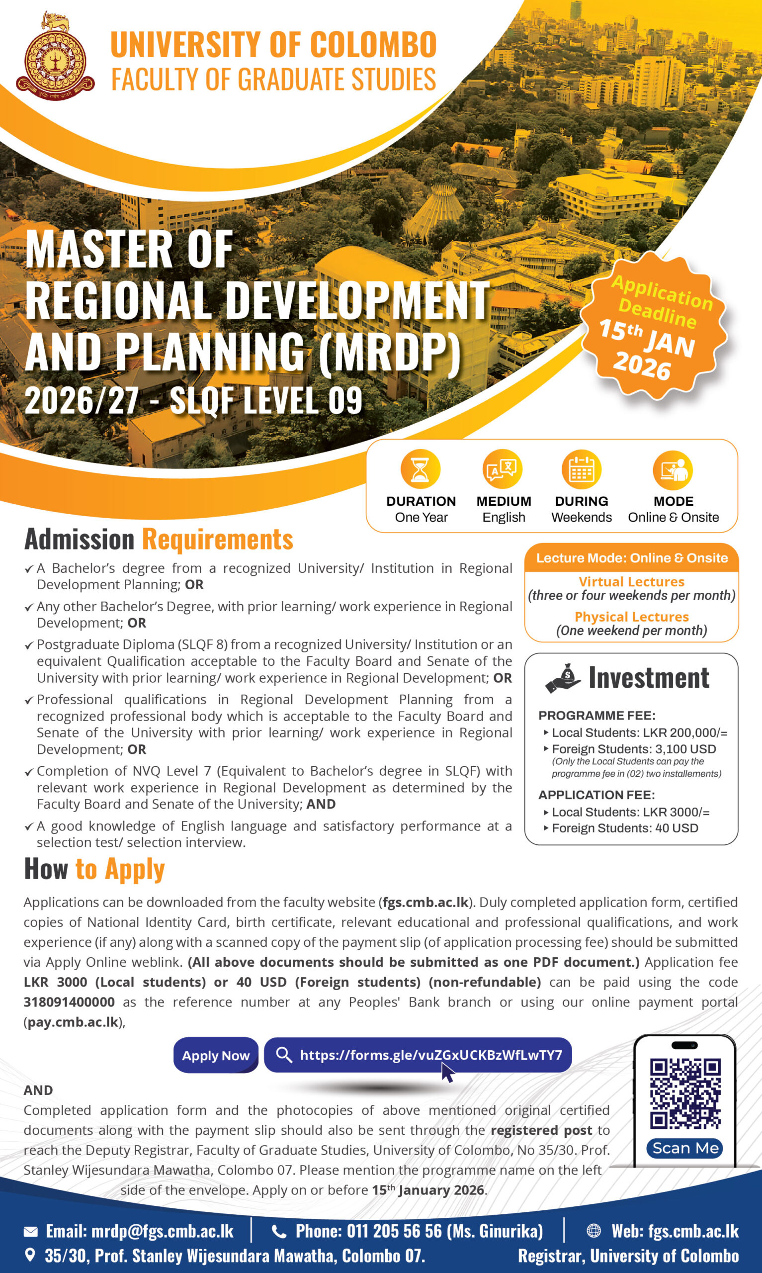 DURATION: 1 Year Address Faculty of Graduate Studies, University of Colombo View map Categories Courses , FGS , Masters , Postgraduate Courses Read More Related Course Advance Certificate course in Ayurveda Caregiving Application Calling for Counselling & Psychology Course Programs – IHRA