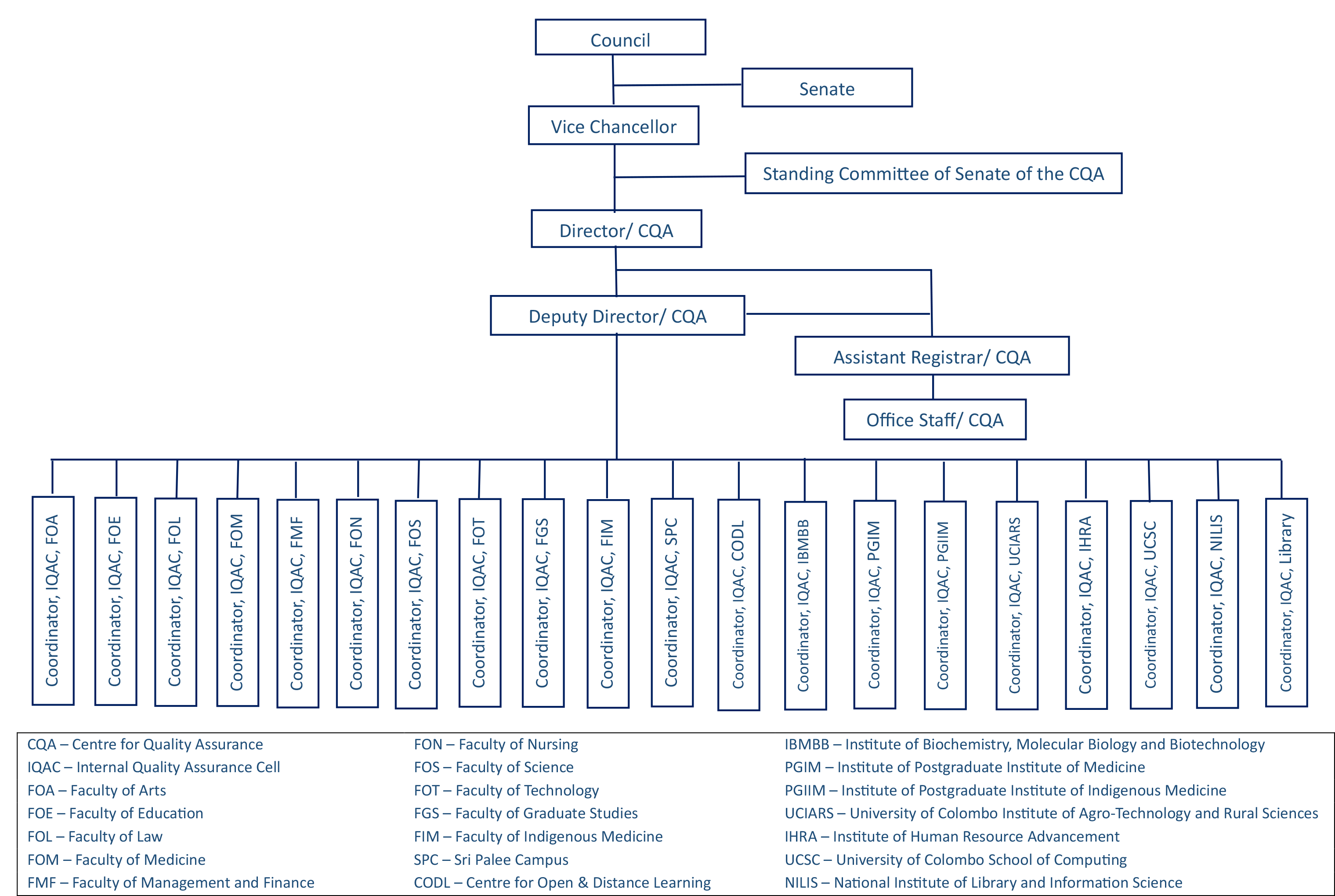 The Centre for Quality Assurance (formerly The Internal Quality Assurance Unit) was established by the Vice Chancellor, Senior Professor Kshanika Hirimburegama in 2010. The act was in line with the advent of the subject and institutional review process being launched in Sri Lanka, by the Quality Assurance and Accreditation Council of The University Grants Commission.
